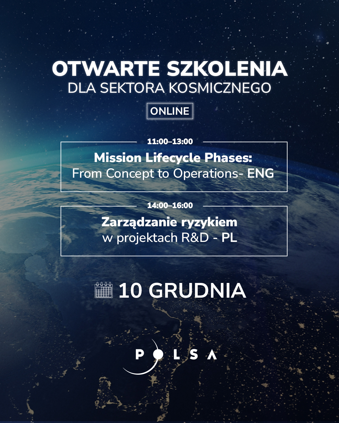 Polska Agencja Kosmiczna serdecznie zaprasza do udziału w otwartych szkoleniach online, które odbędą się 10 grudnia 2025 r. To doskonała okazja, aby poszerzyć wiedzę, wymienić doświadczenia oraz uzyskać praktyczne umiejętności w obszarach związanych z sektorem kosmicznym.